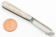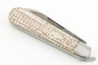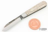 This Heritage Jack from Northwoods Knives features a drop point blade with swedge and long pull nail nick. The handle has stainless steel bolsters with burlap micarta covers over steel liners and stainless steel spring. Has half-stop. Includes a brown leather slip sheath and challenge coin.  Excellent Condition.