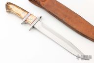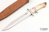 This Loveless Style Big Bear Sub-Hilt Fighter from Richard A. Rotella features a mirror polished clip point blade with sharpened top edge, .286" blade stock and 1.281" blade depth, full tapered tang construction. The handle is comprised of a stainless steel guard and sub-hilt, mammoth ivory scales over red liners. Lanyard tube in pommel. Includes leather sheath with belt loop. #078 on the tang. New from maker. Comes with COA dated May 10, 2023.