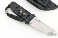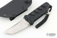 This very well done tanto by RJ Martin features a satin finished tanto blade with deep swedges. Blade is .245" thick and 1.205" deep.  Handle is black cord wrapped over ray skin and has Turks head bolster wrap.  Has a samurai menuki. Comes with leather covered Kydex sheath. Excellent condition.