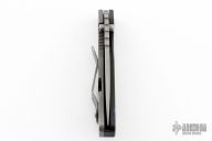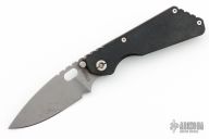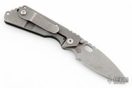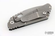 This PT by Strider Knives features a bead blasted drop point blade with thumb hole, dual thumb studs and notched thumbrest. The handle has black G-10 show side and backspacer with a bead blasted titanium lock side with tip up clip. Lanyard hole in pommel. Has some scuffs/scratches, otherwise okay condition.