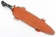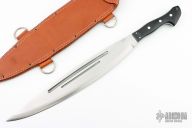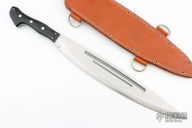 This Barong from Bark River features black linen micarta scales, full tang construction with .181" blade thickness and 2.475" blade depth. Satin finished blade with fullers. Comes with a brown leather sheath. Excellent condition.