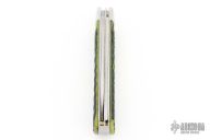 Handle: The teardrop shaped handle has stainless liners supporting securely pinned, Green Jigged bone covers for rugged visual appeal and traction in the hand. Brushed short stainless bolsters at the pivot are flush fit to the scales. Strong, full length stainless back springs, brass lanyard tube and pins complete the construction along with a wide, "Urban Jack" Bowtie shield round out construction.