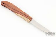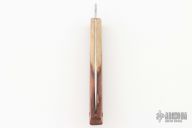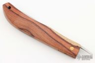 This friction folder by Yoshimi Kotoh features a VG-10 blade with friction folder style opening. The handle has Bombay wood scales, with a lanyard hole at the butt. Comes with a leather pouch. New condition.