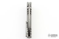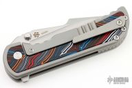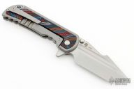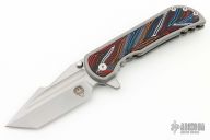 This Apocalypse Flipper by Mechforce is an Alphahunter design. It features a two-tone blade with fullers, dual thumbstuds and a flipper. The handle has a bead blasted titanium frame with Topo G-10 inlays, titanium backspacer and tip up clip. Rides on bearings, nice detent, lockup and blade seating. Comes with original case. New from maker!