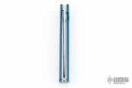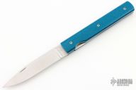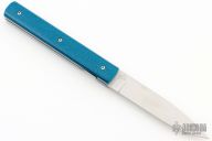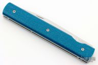 This linerlock by Perceval features a satin finished blade with nail nick. The handle has blue acrylic scales, stainless steel liners. Nice detent, lockup and blade seating. Excellent condition. Comes with original box and black leather slip sheath.