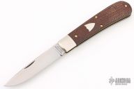 This knife by Great Eastern Cutlery features a satin finished drop point blade with swedge and long pull. The handle has steel bolsters and burlap micarta covers and steel pins over steel liners and backspring. This knife features a half stop and the blade is flush in the open and closed positions. Includes original cardboard tube and wax paper wrap. Excellent condition.