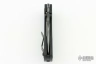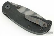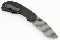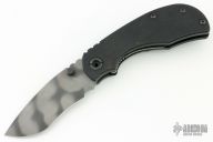 This RCC Linerlock by Mick Strider features a tiger striped recurve blade with notched thumbrest and dual thumbstuds. The handle has black G-10 scales, titanium liner and a flamed tip up titanium clip. Nice detent, lockup and blade seating. Has some light scuffs and scratches, otherwise good condition.