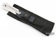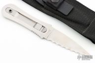 This boot knife by Gerber is a Blackie Collins design, it features a satin finished blade with a fully serrated edge, .169" blade stock and 1.075" blade depth, full tang construction. The handle has a clip that holds it in the sheath. Comes with black plastic sheath in a nylon sheath. Comes with original box and papers. Excellent condition.