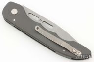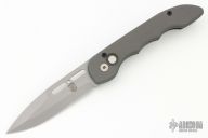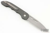 This Gypsy Auto by Rob Dalton has a bead blasted spear point blade. Handle is grey anodized aluminum with titanium tip up clip. Has some light scuffs and scratches, otherwise great condition. #81709