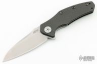 This 0770CF Linerlock Flipper (#1241) has a stonewashed drop point blade with notched thumb rest. Handle is carbon fiber with stainless steel single liner (lock), and black stainless steel tip up clip (RH/ LH reversible). Nice action, lockup and blade seating. Comes with original box. Has scuffs and scratches otherwise the knife is in good condition.
