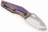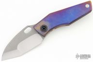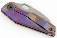 This Mick Strider custom SJ75 framelock folder features a satin/bead blast finished blade with a Nightmare Grind and grooved anodized titanium handle/frame. Contoured blade spine and inside edges of frame. Nice detent, lock up and blade seating.  Excellent Condition.