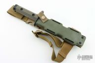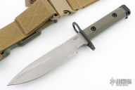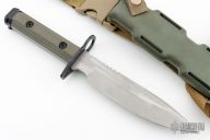 This ZT-9 Bayonet by Zero Tolerance is a Mick Strider design. It features a tumble finished drop point blade with swedge, notched thumbrest and partial serrations. The handle has a black oxide coated stainless steel guard with muzzle hole and machined OD G10 scales over full tang construction. Bayonet lug clasp on pommel. Includes original sheath with belt loop. Sheathing marks are visible on the blade otherwise the knife is in good condition.