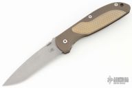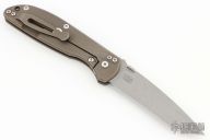 This Firetac by Hinderer features a drop point recurve working finished blade with notched thumbrest and a thumbdisc. The handle has a battle bronze titanium frame, pocket clip is reversible. The circular thumb stud is removable; there is a lanyard hole at the butt. Excellent Condition. Comes with original box and extra hardware. Comes with a black G-10 scale as well.