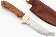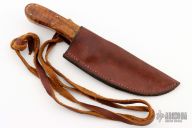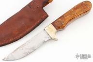 This knife by Terry L Miller features a mirror polished blade with .155" blade stock and 1.176" blade depth, full tang construction. The handle has a nickel silver guard, wood scales. Comes with a brown leather sheath. Has some patina/oxidation/scrathces, otherwise good condition.