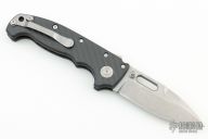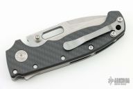 This AD20S by Andrew Demko features a stonewashed spear point blade with notched thumbrest and dual thumbstuds.   The handle has a carbon fiber frame with a tip up stainless steel clip and "Shark" lock release on the spine. Comes with original box. Excellent condition.