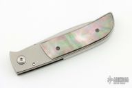 This TTF-6 linerlock by Bob Terzuola features a tumbled blade with a single titanium thumbstud. The handle has a bead blasted titanium frame with black lip pearl scales and a titanium backspacer. Smooth action. Nice detent, lockup and blade seating. Excellent condition.