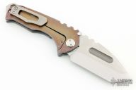 This Praetorian Genesis T by Medford Knife and Tool features a tumble finished tanto blade with fullers and notched thumbrest. The handle has a textured and anodized titanium frame with a titanium tip up pocket clip and a D2 backspacer/glass breaker with lanyard bail. Excellent condition.