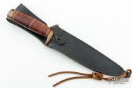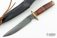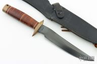 This SBR-80 Recon Bowie has a blued blade with hidden tang and brass double guard. Blade width is 1/4", depth 1-3/16". Handle is stacked leather with white spacers, brass double guard, and brass butt cap with lanyard hole. Comes with a black leather sheath. Patina on brass, otherwise excellent condition.
