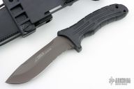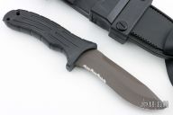 This Gen-1 Orca X-15-T.N GSG-9 Dive Knife by Boker features a PVD coated blade with a partially serrated blade, the "plain edge" portion intentionally toothy, sharpened swedge, .235" blade stock and 1.407" blade depth, hidden tang construction with a black FRN Grip. Comes with a black molded plastic sheath. Has some scuffs, otherwise excellent condition. Discontinued.