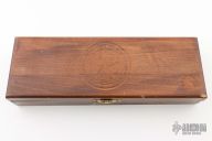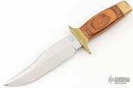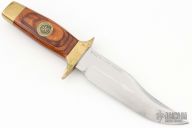 This fixed blade by Smith and Wesson features a wood handle with brass guard and butt cap. Mirror polished bowie style blade with 1/4" blade stock and 1 1/4" blade depth. Has "Texas Rangers 1823-1973" stamped on blade and a "Texas Rangers Commemorative Commission" inlay on handle. Has been used and sharpened, has scratches, fair condition. Includes a wooden display box, but it is a bit rough.