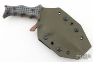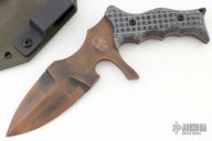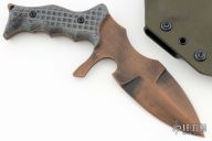 This UUK is a Laci Szabo design made by Robert Martin. It features a black/bronze coated double-edged blade, .290" blade thickness and 2.035" blade depth, full tang construction. The handle has blue denim micarta scales with frag pattern. The UUK, or Urban Utility Knife is the most well-known of Laci Szabo's designs. One mean field-tested tactical. Comes with kydex sheath with belt loops. New from maker.
