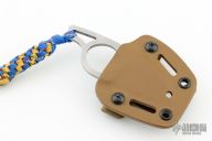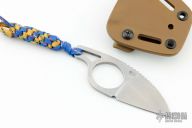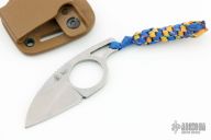 This knife features a stonewashed drop point blade with notched thumbrest, 5/32" blade stock and 1 1/4" blade depth, integral construction. Comes with a kydex sheath with belt clip. Excellent condition.