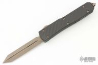 This knife has a double edged tanto blade with a bronzed Apocalyptic finish, blood grooves and holes in blade. The handle is carbon fiber and aluminum with a tip down stainless clip and glass breaker at the butt. S/N 60562. Dated 11/2015. Light scuffs are visible on the handle otherwise the knife is in good condition.