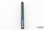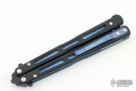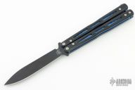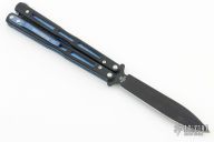 This Model 51 Morpho Balisong from Benchmade has a black finished D2 stainless steel spear point blade. Handle is black G10 with blue jeweled/ anodized titanium liners and blue anodized titanium tip up clip. Excellent condition.