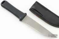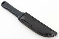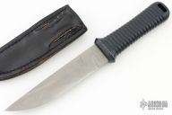 This Tanto by Kuzan Oda was produced by Pacific Cutlery in Japan. It has a bead blast finished blade with .159" blade stock and 1.187" blade depth, hidden tang construction with a black aluminum handle. Comes with a black leather sheath. Has scuffs and scratches, wear on the handle, has been sharpened, otherwise good user condition.