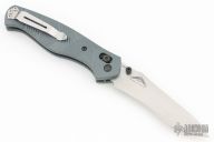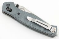 This Gaucho Axis lock folding knife by Benchmade features a satin finished tanto blade with dual thumbstuds. The handle has grey textured aluminum scales, stainless steel liners and stainless steel tip up clip. Comes with the original box and papers. Excellent Condition.