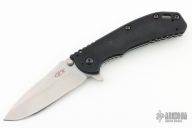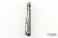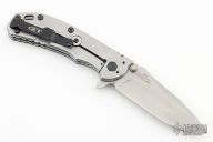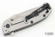 This 0566 Hinder Design Flipper by Zero Tolerance features a tumble finished drop point blade with swedge, dual thumb studs, notched thumb rest and flipper. The handle is comprised of a black G10 scale over a titanium liner and a tumbled titanium lockside over black barrel spacers. The black coated steel tip up clip is reversible for right or left hand carry. Lanyard hole in pommel. Has a couple scuffs and has been resharpened, otherwise good condition.