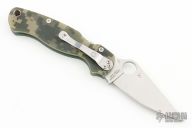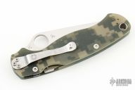 This Paramilitary 2 Linerlock Folder has a satin clip point blade with thumb hole and notched thumb rest. Handle is digi camo G10 with stainless steel liners and stainless steel 4-way reversible clip. Has some scratches and has been resharpened, otherwise good user condition.