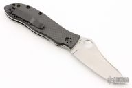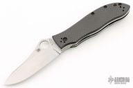This Gayle Bradley liner lock folder by Spyderco features a satin finish blade with thumb hole. Carbon fiber pattern G-10 scales, polished stainless steel liners, and black coated stainless steel pocket clip, tip up carry, 4 way reversible. Strong lock up, nice detent and blade seating is center. Comes with original box and papers.  Excellent condition.