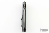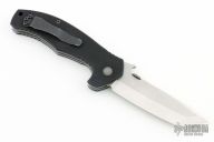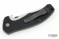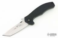 This Roadhouse by Emerson Knives has a tanto blade with a thumbdisc and wave feature. The handle has textured black G-10 scales, titanium liners, black barrel spacers and a tip up black stainless steel clip. S/N 1247. Excellent condition.