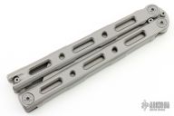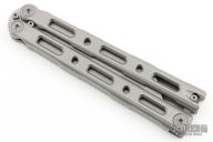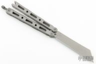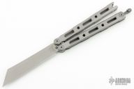 This Model 87 Balisong by Benchmade features a tumble finished wharncliffe style blade. The handle has an integrally constructed, skeletonized titanium frame with bead blast finish. Spring-loaded T latch on pommel. Comes with original box, sheath and papers. Has a couple light scuffs, otherwise excellent condition.