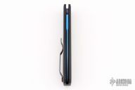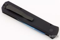 This Godfather by Pro-Tech features a Sapphire blue blade. The handle has a black aluminum frame with black hardware and black stainless steel tip up clip, abalone inlaid push button. Comes with original box and papers. Excellent condition.