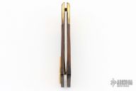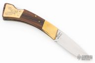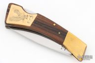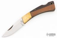 This lockback by Jet-Aer Corp features a satin finished blade with nail nick. The handle has brass bolsters and liners, wood scales, ivory paper micarta overlay with eagle scrimshaw. Comes with original black leather sheath. Has some scratches, otherwise good condition.