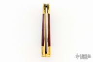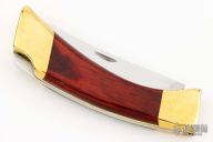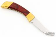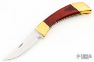 This Lockback by Browning features a polished blade with nail nick. The handle is comprised of dovetailed brass double bolsters with integral liners and dymondwood scales, and a stainless steel lock back. Includes original brown leather sheath. Excellent condition.
