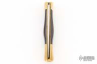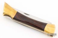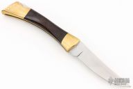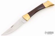 This Lockback by Browning features a satin finished blade with nail nick. The handle is comprised of dovetailed brass double bolsters with integral liners and dymondwood scales, and a stainless steel lock back. Includes original brown leather sheath. Has some scratches, otherwise good condition.