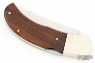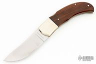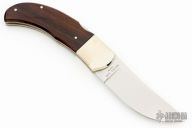 This Lockback by Browning features a satin finished blade with nail nick. The handle is comprised of dovetailed nickel silver bolsters and liners, rosewood scales, and a stainless steel lock back. Includes original brown leather sheath. Excellent condition.