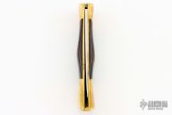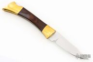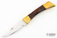 This Lockback by Browning features a polished blade with nail nick. The handle is comprised of dovetailed brass double bolsters with integral liners and dymondwood scales, and a stainless steel lock back. Includes original brown leather sheath. Has some light scratches and dings, otherwise good condition.