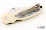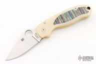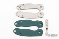 This Para 3 by Spyderco was a Knifeworks Exclusive. It  features a satin finished blade with thumbhole and notched thumbrest. The handle has custom scales with stainless steel nested liners, 4-way reversible clip. Comes with original box, green G-10 scales, and papers. Excellent condition. Coems with a set of titanium scales and backspacer by Ripps Garage Tech