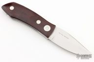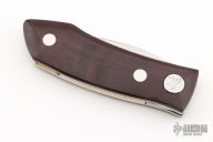 This Barry Wood design swing lock folder features a satin finish blade and satin finish stainless steel frame with maroon linen micarta scales. This is a very unique scissor opening folder, which when the blade is fully open and locked in place is almost a fixed blade knife. The handle is nicely contoured for a comfortable grip. Opening is accomplished by lighting pressing down and outward at the rear indentation on the spine, which releases the locking pin and allows one side of the handle and the blade to rotate down then forward until the blade locks in the forward position. The one side of the handle continues to rotate back until it locks in place. Closing requires the same slight thumb pressure at the indentation to release the locking pin, then the one side of the handle is rotated back and around, catching the blade and aligning both with the other side of the handle in a locked closed position.  Has some light scratches, otherwise excellent condition.