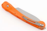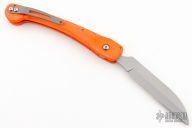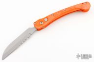 This side-opening automatic by Rob Dalton features a bead blasted partially serrated blade and orange G10 frame. Bead blast tip up titanium clip. Strong and fast coil spring opening. Has a nice lightweight feel. Perfect function. Excellent condition.