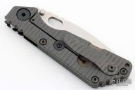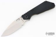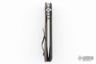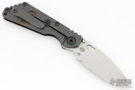 This SNG framelock folder by Mick Strider features a stonewashed blade and a dimple pattern black G-10 and flamed titanium frame and tip up titanium clip. Includes a "Lock Bar Stabilizer" for maximum reverse lock retention. Nice detent, lockup and blade seating. Excellent condition.