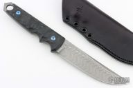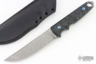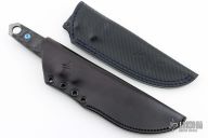 Handcrafted in Italy, this handsome Fox Ryu Fixed Blade is approximately 10 5/8 inches long (total) and weighs approximately 7.3 ounces. The contoured handle is textured Black Camo Carbon Fiber with PVD Titanium screws, a large lanyard hole, finger grooves, and striker pommel. This knife utilizes a 5 1/8" Straight-back blade with a plain edge, 5mm (0.20") thickness, finger guard, finger choil, and spine jimping. The blade material is BALBACH DAMAST Damascus Steel with Herringbone pattern. The knife is presented with a Black Leather Belt Sheath. Comes with original box and two sheaths. Excellent condition.