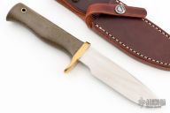 The Model 28 by Randall Made Knives is an excellent skinning and outdoors knife. Has a satin finished drop point blade with false top edge and notched thumbrest, stainless steel blade, .161" blade stock and 1.084" blade depth, full tang construction. The handle has a brass guard, green linen micarta handle and a lanyard hole at the butt. Comes with brown leather sheath and original paper wrapping. New condition.