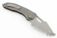 This Stitch Auto by Microtech Knives features an Apocalyptic finished blade and false top edge, partial serrations, notched thumb and finger rests. The handle has a "Natural Clear" anodized and milled aluminum handle with a bead blasted titanium backspacer and a bead blasted stainless steel clip, tip up carry, lanyard hole at the butt. Comes with original box and papers. S/N of 15194 and dated 11/2023. Excellent condition.