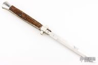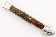 This 25" Picklock Auto by Renzo Passcotto features a mirror finished bayonet ground blade with false edges. The handle has nickel silver bolsters, stag scales, brass liners and stainless steel backspacer. Has safety. Excellent condition. Comes with a felt bag. #21 of 30. Only two were made in stag.