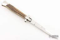 This large Swivel Bolster from A.G.A. Campolin features a mirror finished spear point blade with false top edge. The handle has nickel silver bolsters and pommel with stag scales over brass d-stamp liners and stainless steel backspacer. Has some light scratches, otherwise excellent condition. This knife was made back in 1990 before they started marking them "AGA CAMPOLIN", made by Grandpa Angelo Campolin Senior.
